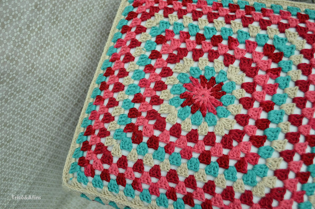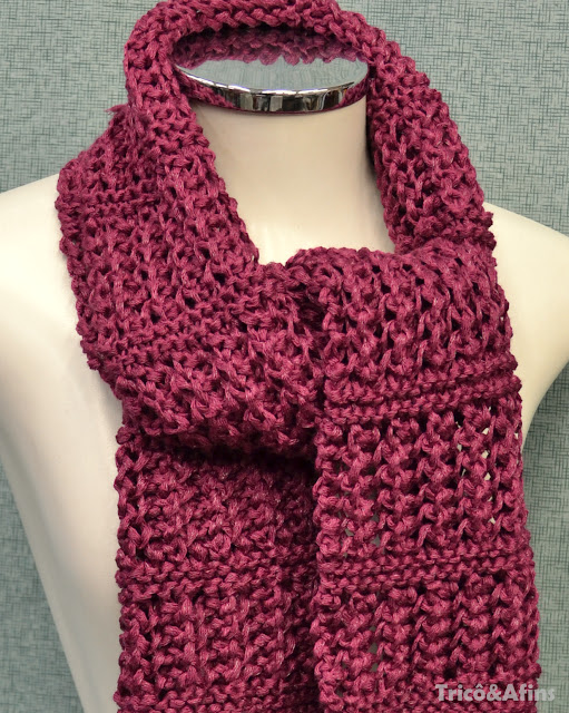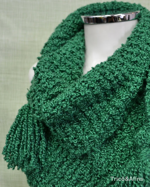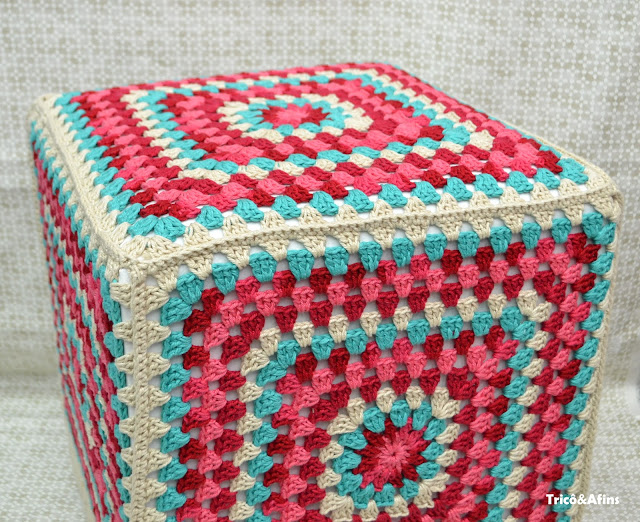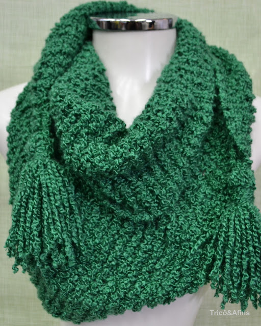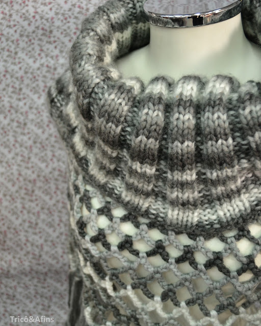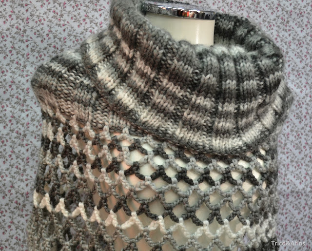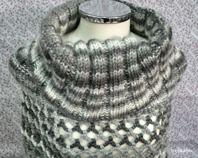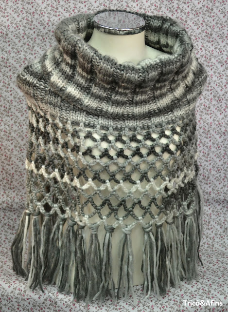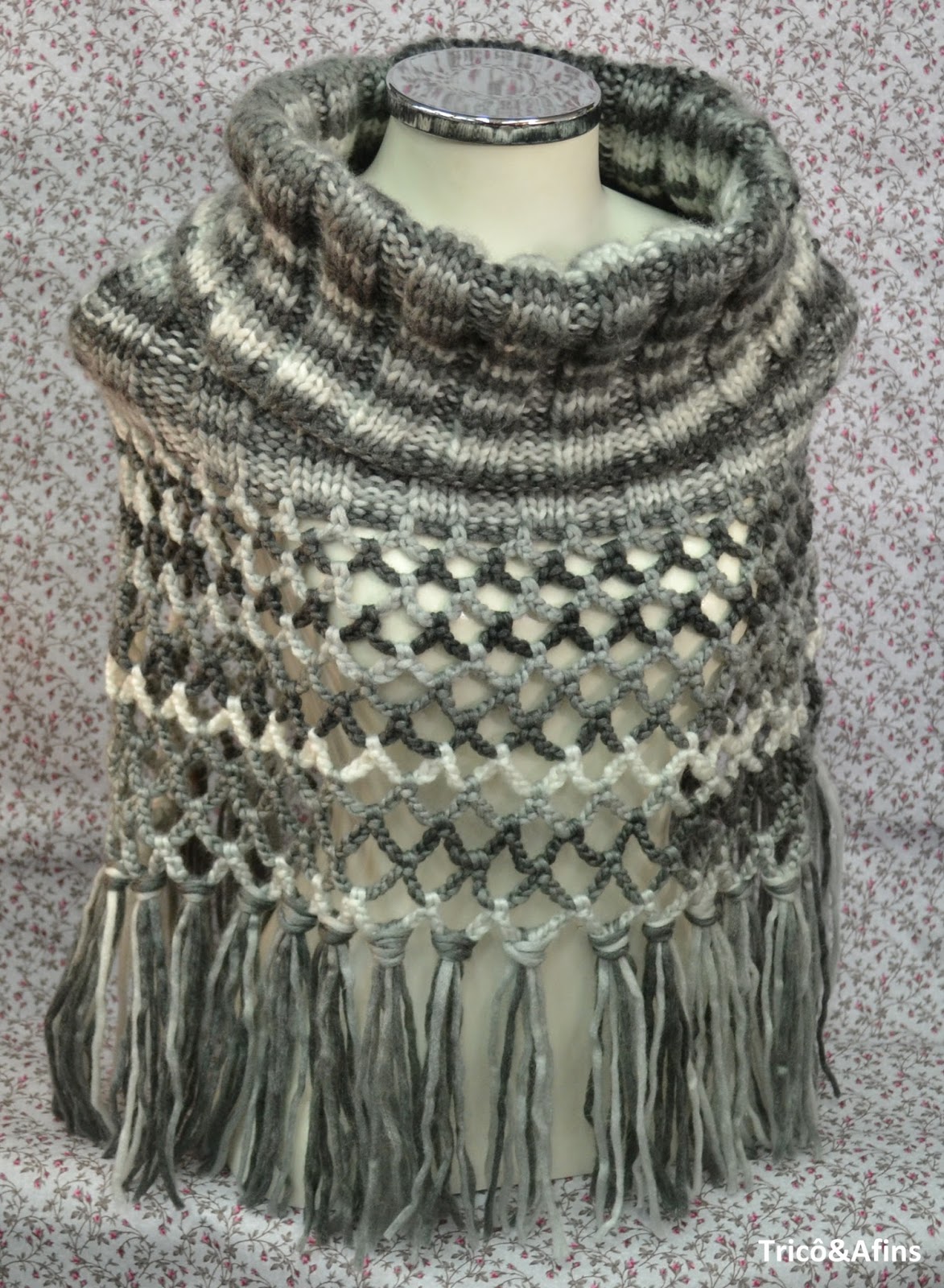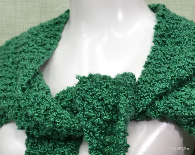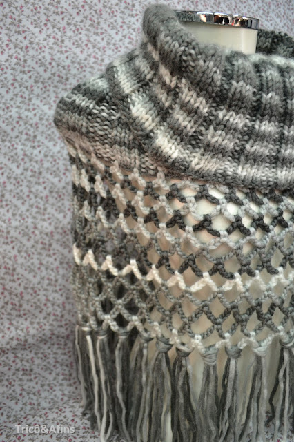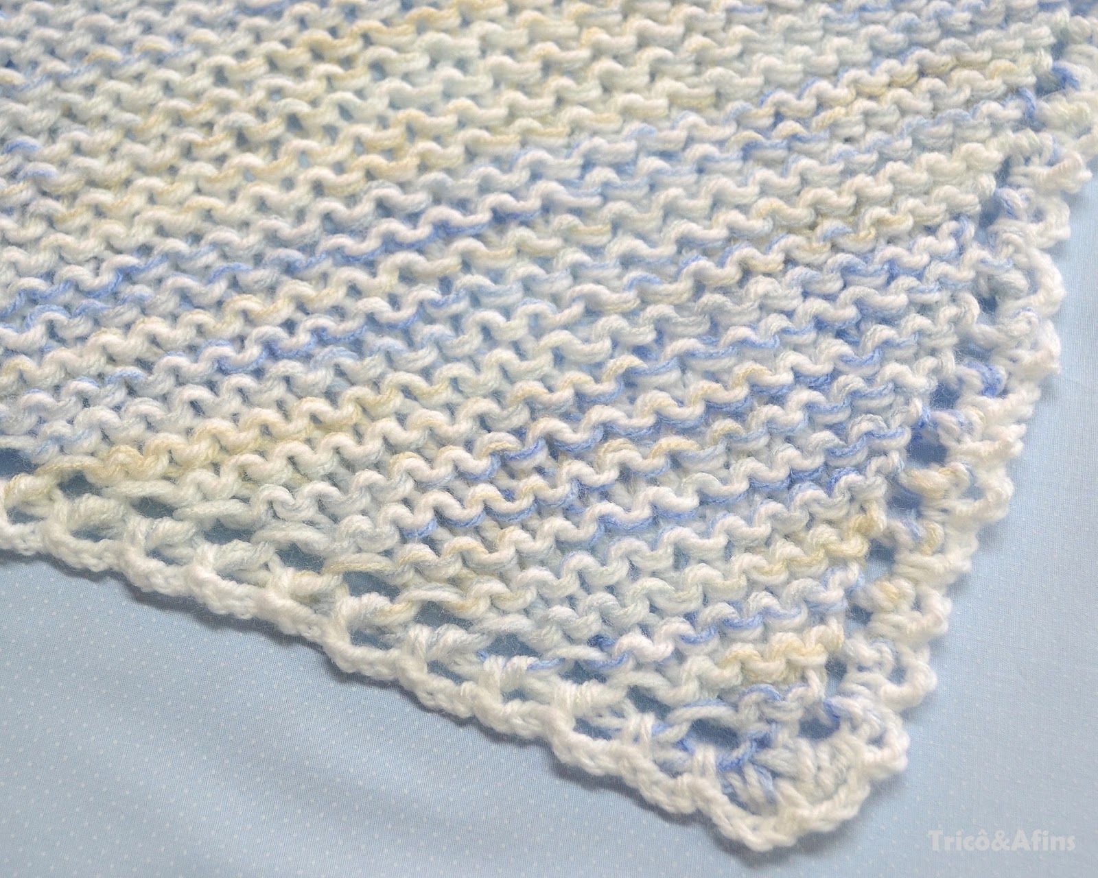 Acabamento: apenas uma carreira de 4 correntinhas e ponto baixo em toda a volta do xale, pegando nos espacinhos que ficaram na lateral do trabalho em tricô.