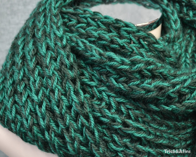 Dois tons de verde da lã Sedificada/Pingouin. Usei apenas 1 novelo de cada cor para fazer uma Gola Oito bem lindona. Olha só!