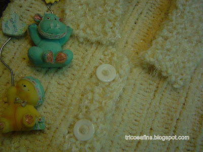 Vamos lá: levantei pontos nas laterais externas, no local das cavas, tudo com a lã Tentação. E também na parte da frente, para a colocação dos botões e no decote para a golinha. Arrematar direitinho e esconder bem as pontas dos fios. Pregar os botões e costurar os lados.