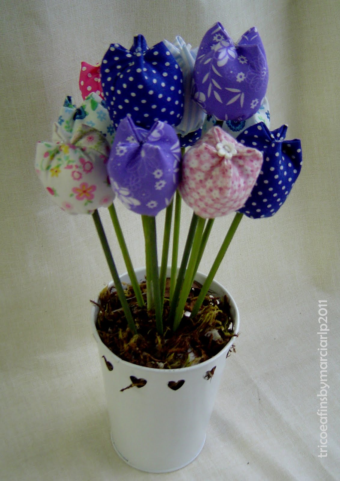 É impossível não se deslumbrar diante de um vaso de tulipas. Originárias da Ásia Central ficaram mundialmente conhecidas como a flor da Holanda, onde são cultivadas em larga escala. Seu nome foi inspirado na palavra “tulipan” que significa “turbante”. Aqui no Brasil, conseguimos encontrá-las em algumas épocas do ano, mas o fato é que dão um certo trabalho para serem cultivadas em clima tropical. Uma vez dei um vaso de presente para minha madrinha, mas acho que ele não deve ter durado muito, pois só depois fiquei sabendo que é necessário colocar pedras de gelo na terra para manter a baixa temperatura do solo. Então, para os apaixonados por essa flor elegante e sofisticada fica a idéia de tê-la sempre ao alcance dos olhos num belo arranjo feito de tecido.
