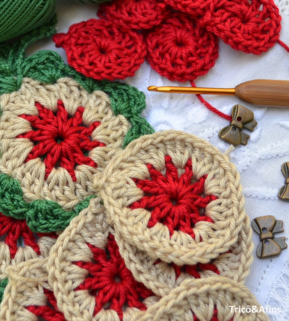 Pequenos círculos crochetados em apenas três carrerinhas com as cores clássicas do Natal.
